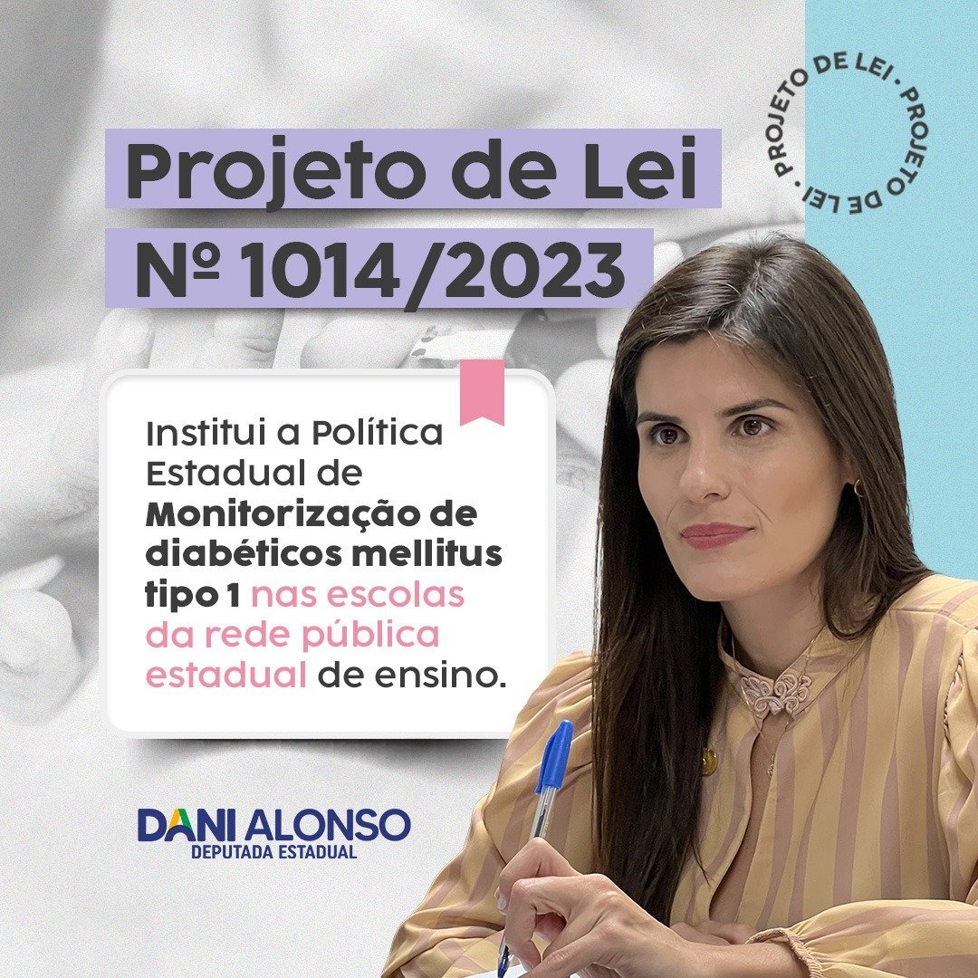 – A deputada Dani Alonso, vice líder do PL na Assembleia Legislativa do Estado de São Paulo (Alesp), apresentou o Projeto de Lei Nº 1014/2023, que visa instituir a Política Estadual de Monitorização de diabéticos mellitus tipo 1 nas escolas da rede pública estadual de ensino. O objetivo da proposta é garantir bem-estar, segurança e acolhimento aos alunos com diabetes tipo 1 no ambiente escolar.
