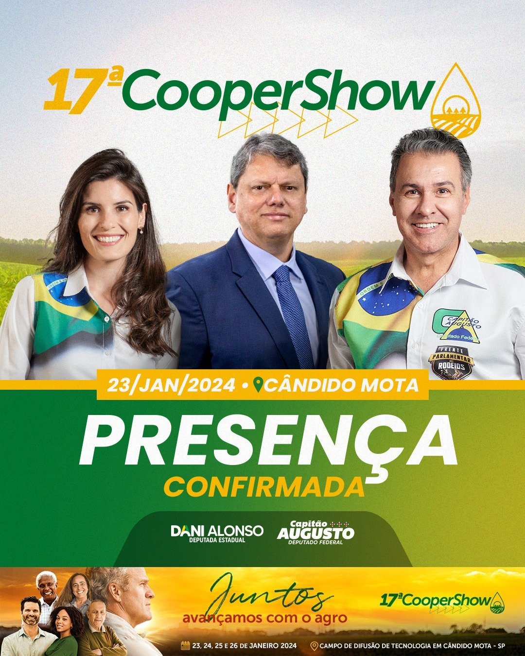 A 17ª edição da Coopershow, que se realizará de 23 a 26 de janeiro de 2024, no Campo de Difusão de Tecnologia em Cândido Mota, contará com a presença de figuras expressivas no cenário político nacional, como a deputada estadual Dani Alonso (PL), o deputado federal Capitão Augusto Rosa (PL) e o ilustre Governador do Estado de São Paulo, Tarcisio de Freitas. A participação do governador no evento é vista como um fortalecimento das políticas de incentivo à inovação no setor agrícola.